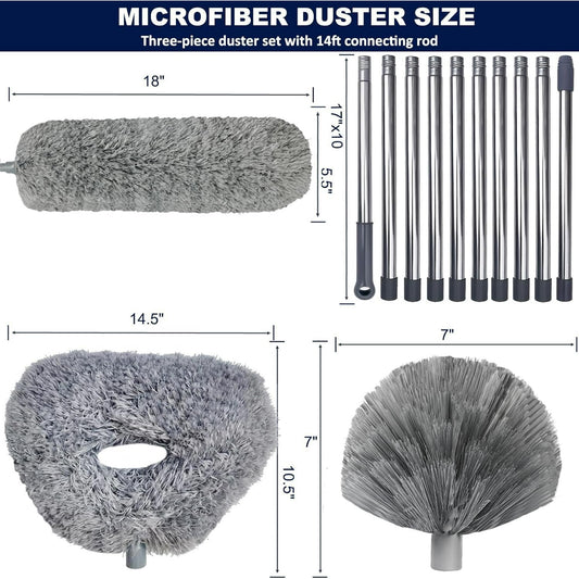 Clnez 20+ Ft High Reach Ceiling Fan Duster & Cobweb & Corner Brush Duster with 3-14 ft Spliceable Pole Microfiber Feather Duster for Spider Web, High Ceiling, Blinds, Furniture Cleaning Tool Kit