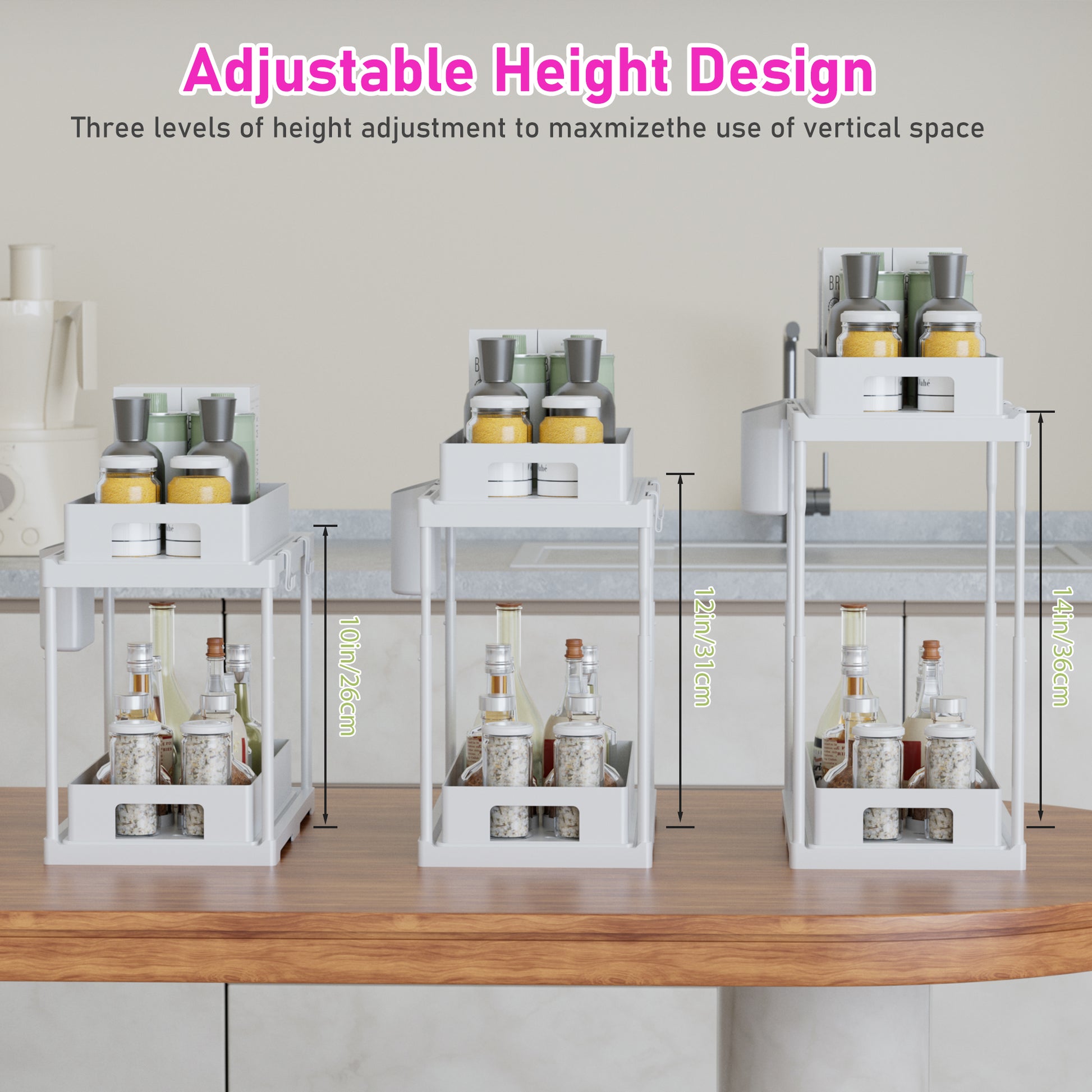 - Adjustable Tube Design for Bigger Size and Higher Height Bottles: Our 2-tier sliding under sink bathroom organizers adopt four adjustable tubes. There are 4 gears to adjust height. You can adjust the height to fit the cabinets in your kitchen. The higher height allows bottles that previously could not fit in the bottom drawer to be placed vertically, giving your kitchen storage more organized.