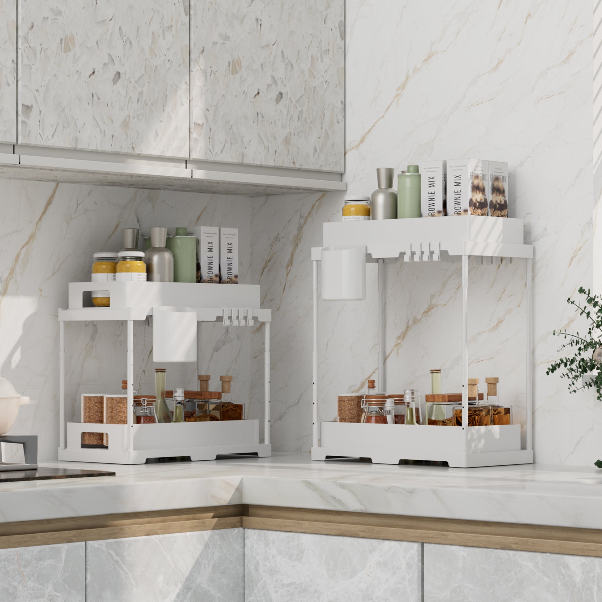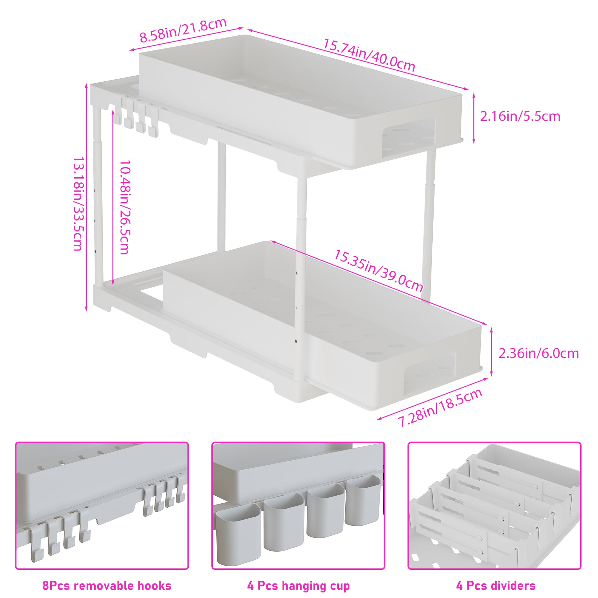 ClozOrg 2 Pack Adjustable Height Under Sink Organizers and Storage, 2 Tier Double Sliding Drawer Cabinet Basket Organizer with Hooks and Hanging Cup, for Kitchen, Bathroom, Garage Storage-White
