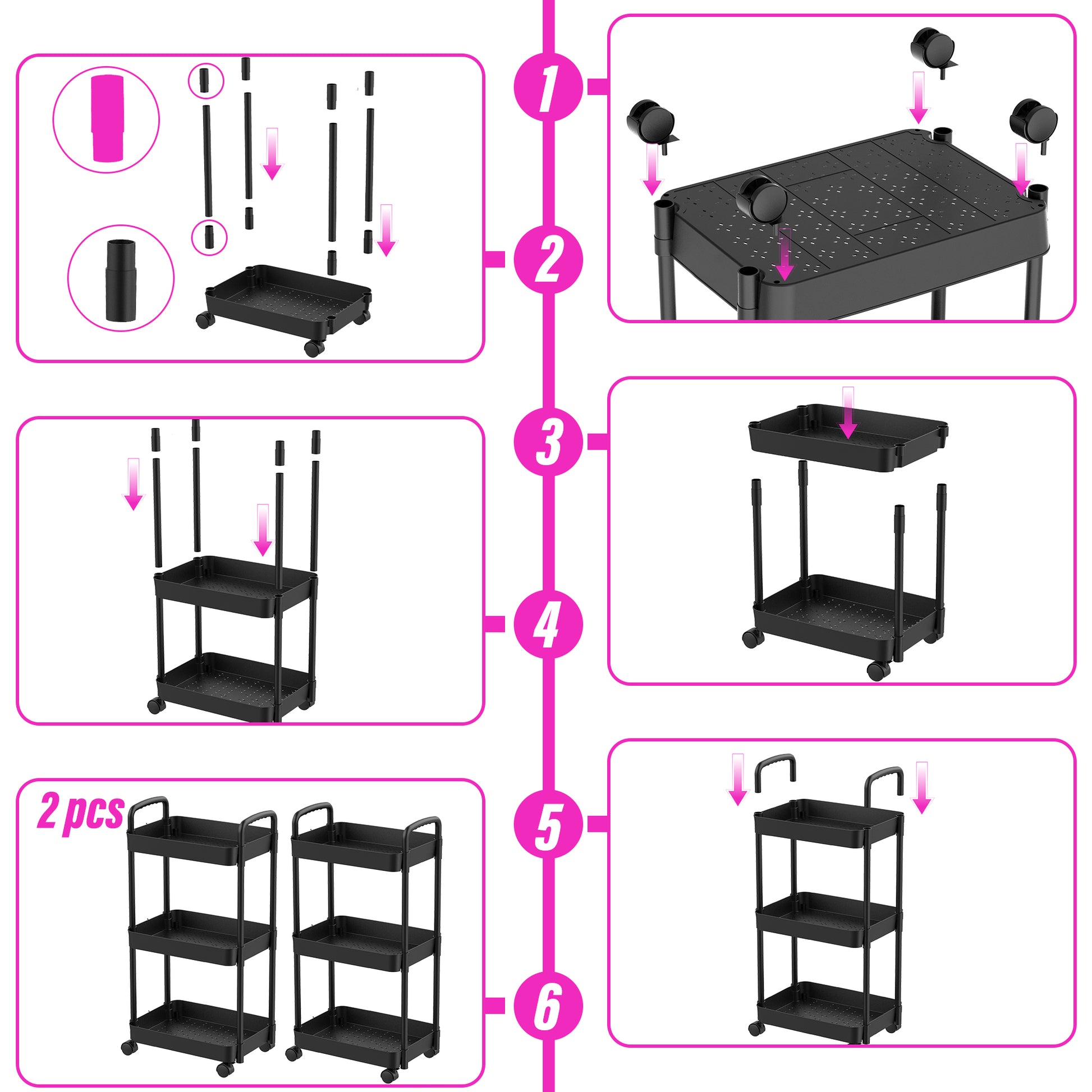 ClozOrg 2 Pcs 3-Tier Rolling Utility Cart, Multifunctional Mobile Storage Shelves with Drawer and Lockable Wheels for Room,Office,Kitchen,Bathroom, Black