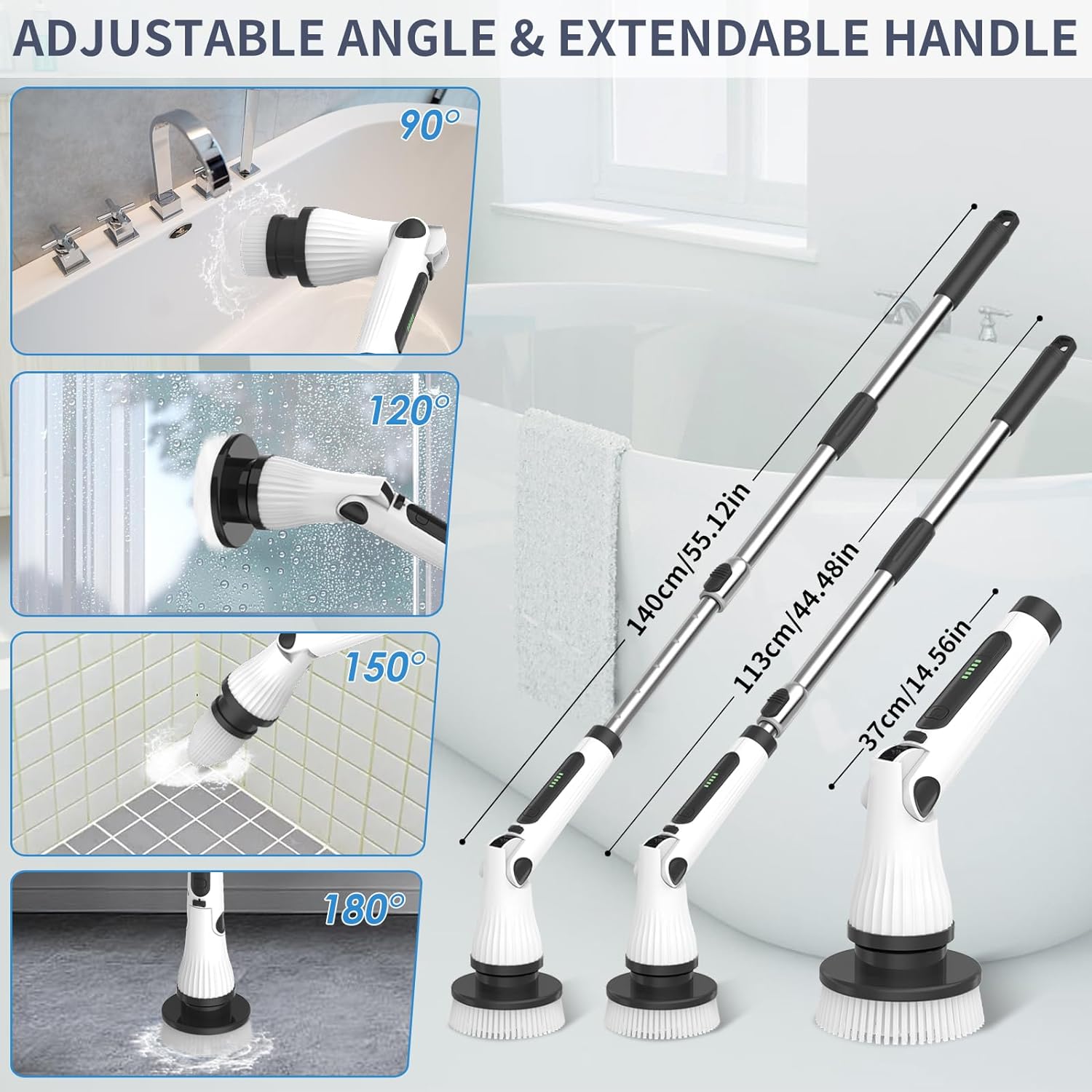 - Adjustable Angle & Extendable Handle: With two detachable handles (up to 54.7 inch) and 6 adjustable angles (180°,165°,150°,135°,120°,105°and 90°),the electric bathroom scrubber helps you clean hard-to-reach areas without having to bend over and kneel down. Lightweight and flexible, making cleaning easier.