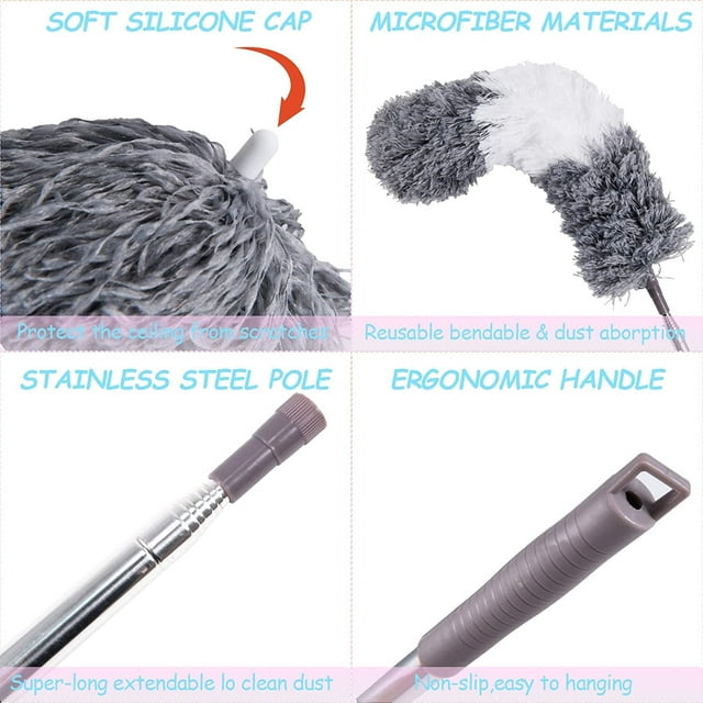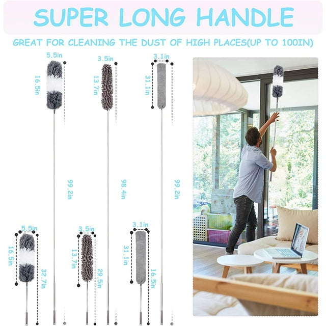 100 Inches Extendable Long Handle Lightweight and high-quality stainless steel telescopic pole, can be extended to 80 inches long, you can easily clean your ceiling fan by extending the pole. 7 Pcs effective cleaning kit. Easily and thoroughly clean by replacing the cleaning head. Detachable and washable Detachable handles make it easy to replace the duster head and wash it after use. Just slide off the duster head from the telescopic pole, and hand washes with warm or low heat water. Clean everywhere in the home Scratch-free microfiber ensures effective dust and dirt removal while protecting your cleaning surfaces, crevice brush makes it easy to clean the small crevices.