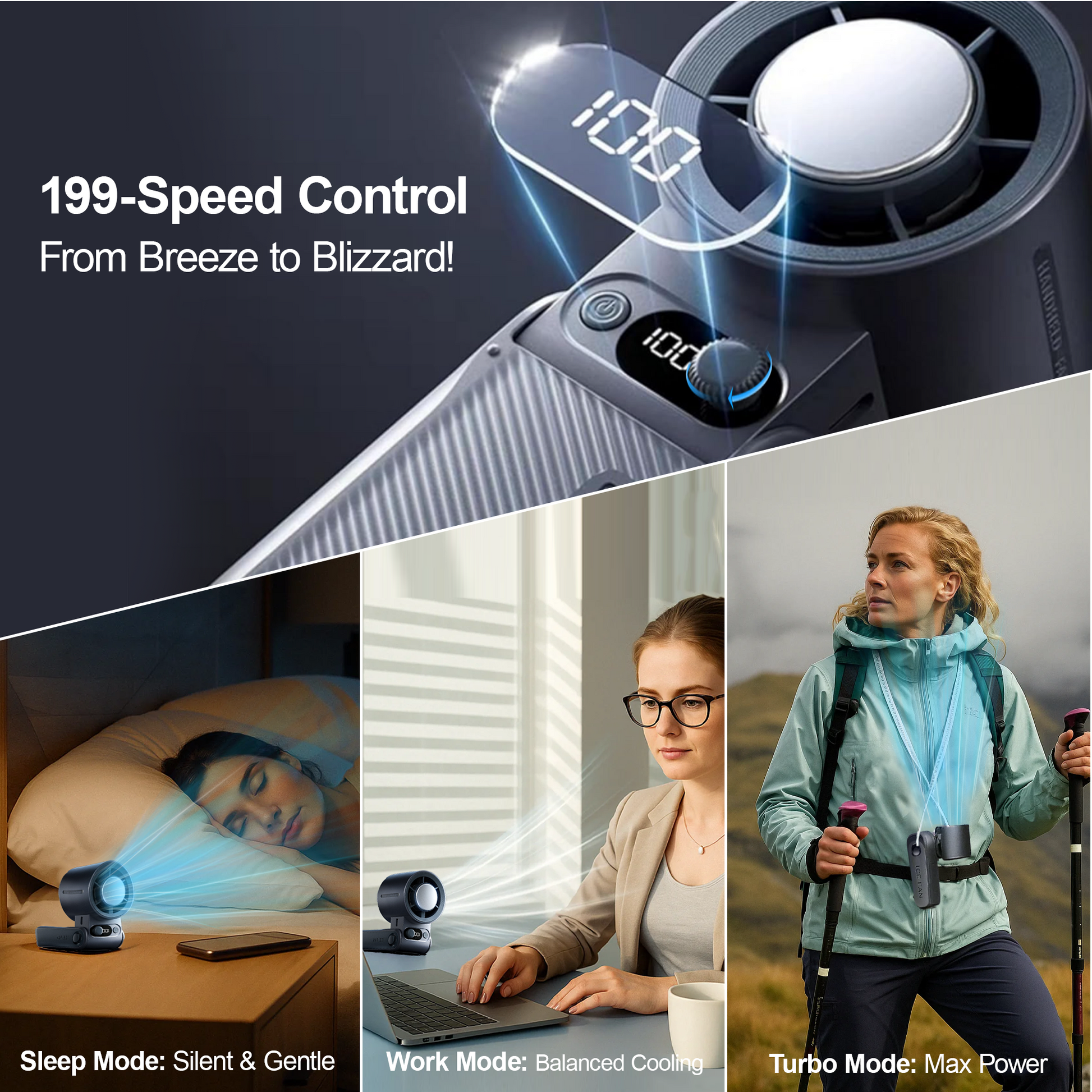 - 199-Speed Precision Control: Tailor airflow from whisper-quiet (sleep/office) to turbo-powered (workouts/hiking).