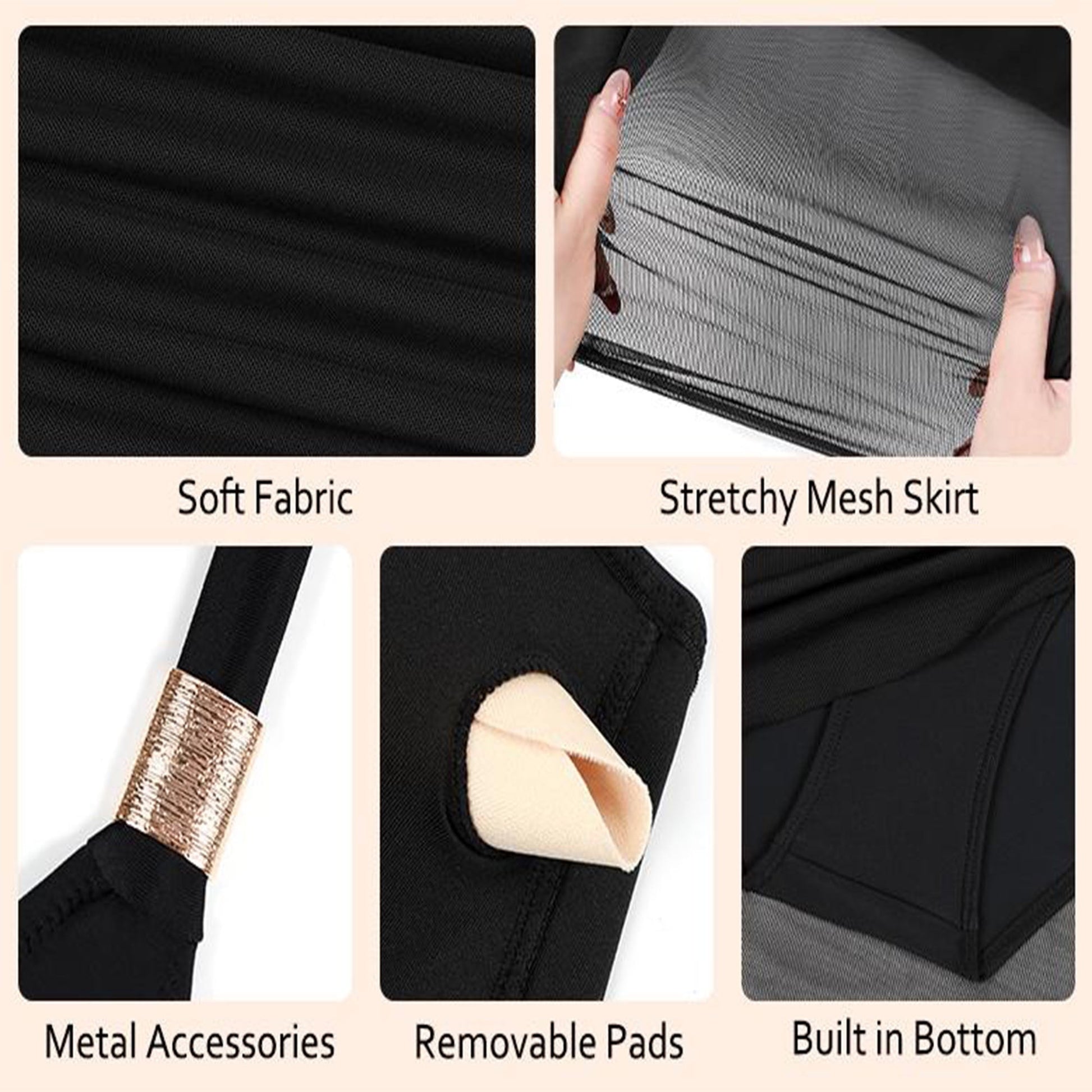 Bikini Top: This tummy control swimsuits for women features a sexy V-neck with transparent edges, removable pads, a self-tie back, and adjustable straps with delicate metal accents, adding a touch of elegance.